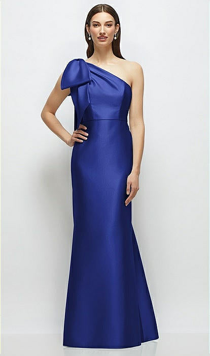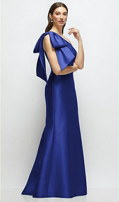 Own the room in this one-shoulder maxi dress. It's the perfect mix of sculpted and soft, with a sleek, tailored bodice that commands attention and smooth satin twill fabric that flows with pure confidence. The oversized pre-tied bow at the shoulder delivers on drama. The trumpet skirt hugs you in all the right places before whispering into a subtle sweep train, finished with a crisp horsehair hem. This long satin dress isn't just stunning, it's unstoppable.