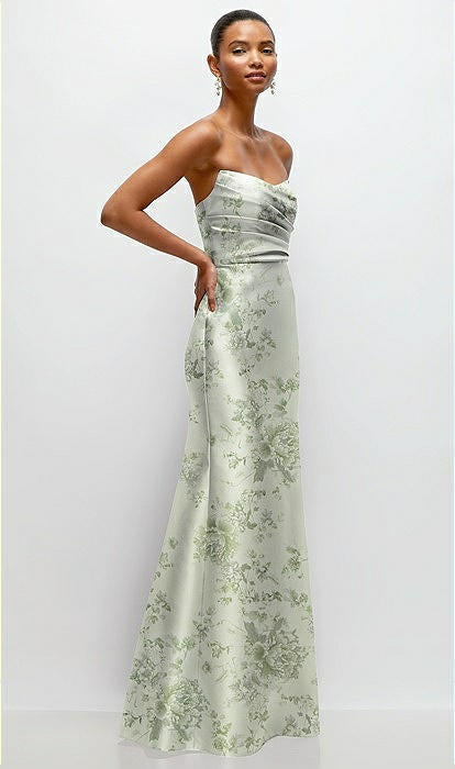 This floral strapless maxi dress combines a chic cat-eye neckline with a beautiful bloom-infused print, creating a standout look. The satin twill fabric feels luxurious, while the draped bodice adds a trendy twist. With a soft trumpet skirt that flows gracefully, this dress will make a stylish statement at any special event.