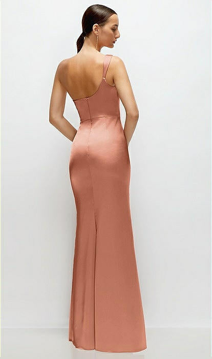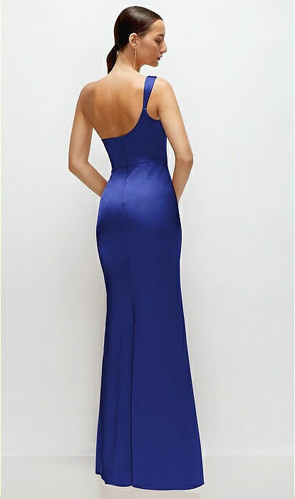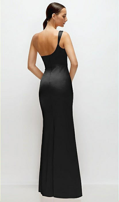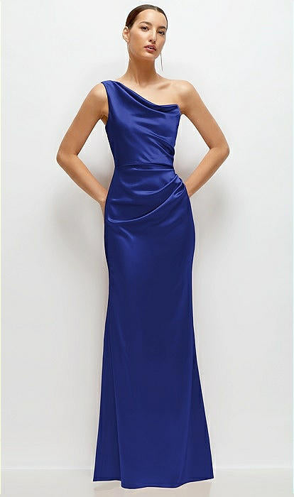 This stunning satin maxi dress channels some serious goddess energy with its effortlessly chic one-shoulder neckline that's all about those soft, sculpted lines. The asymmetrical pleated cat-eye cowl detail adds a pop of drama, draping perfectly for that laid-back elegance. Crafted in smooth, neu stretch charmeuse, the dress hugs your curves with a fit-and-flare silhouette while gentle drapes gather at the side, giving it a captivating, fluid movement. It's the kind of dress that feels both classic and fresh, ready to turn every step into a moment.