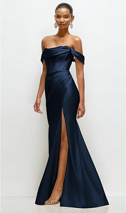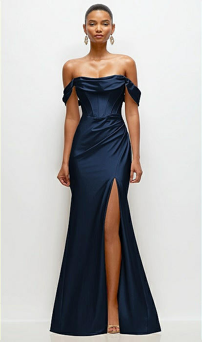 This Luxe Stretch Satin maxi dress brings pure drama. With a perfectly draped cowl neckline and off-the-shoulder flounce sleeves, it's the perfect mix of glam and allure. The corset-inspired midriff, detailed with top-stitched boning, defines and flatters with a modern edge, while the fit-and-flare skirt falls effortlessly, opening into a daring thigh-high slit that's all about making an entrance. With its sleek, structured horsehair hem, this figure-hugging maxi dress is bold and chic—ready to set the vibe for an unforgettable night.