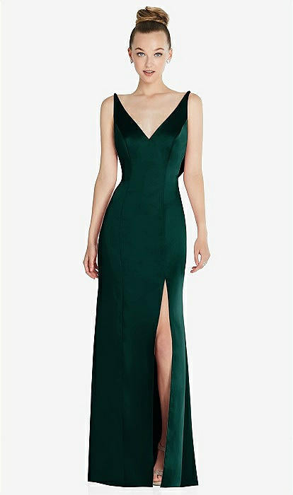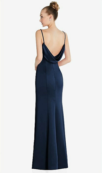 .. Twirl across the dance floor in style with this lux charmeuse V-neck gown. Princess seams create definition that's augmented with a draped cowl on a low back that adds a hint of sensuality. A lovely trumpet skirt completes the look with classic sophistication.