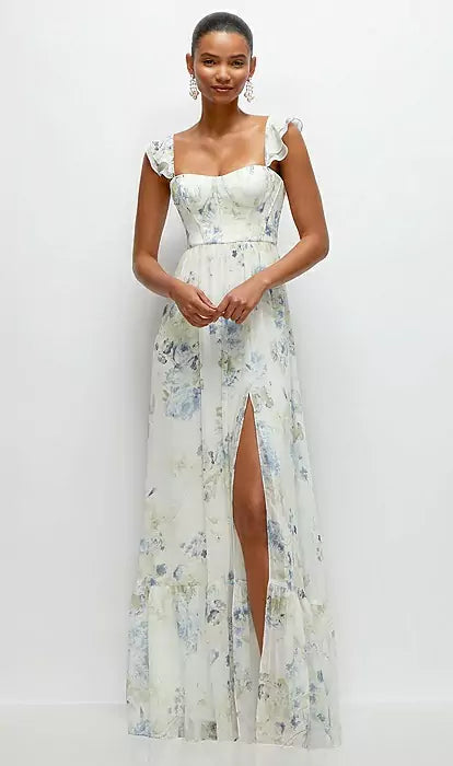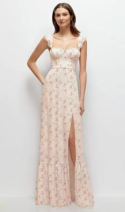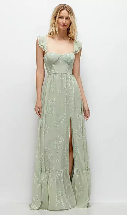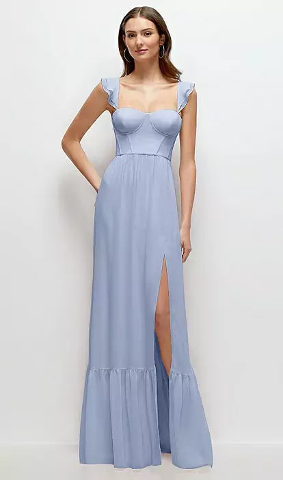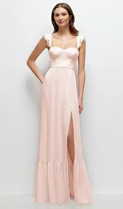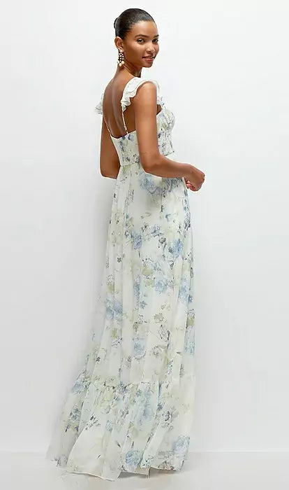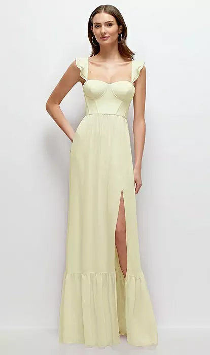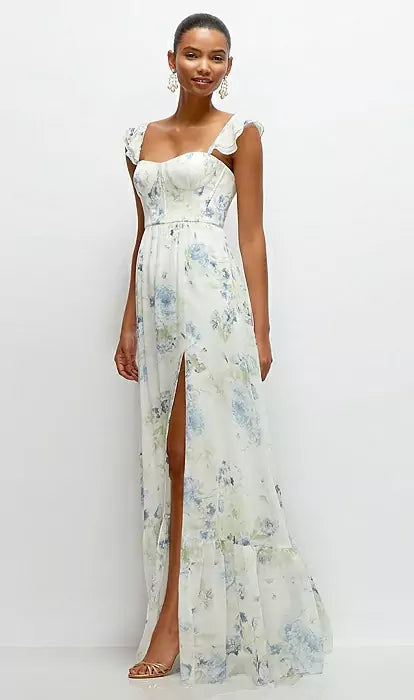 .... Robe longue bustier en chiffon avec bretelles à volants et jupe évasée à ourlet volanté. Cette robe romantique et pleine de charme apporte une touche de fraîcheur à la féminité classique. Avec ses bretelles à volants légers et son...
