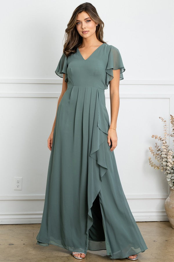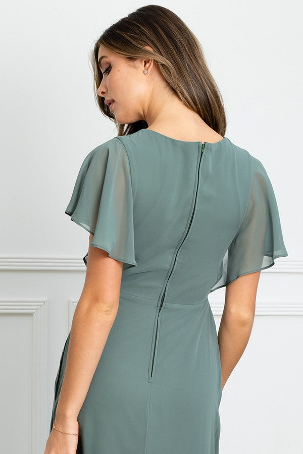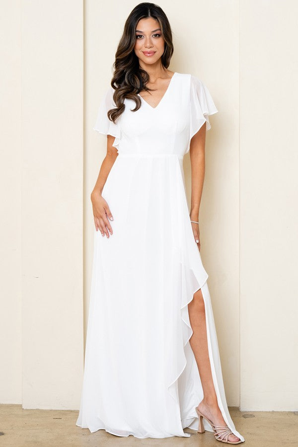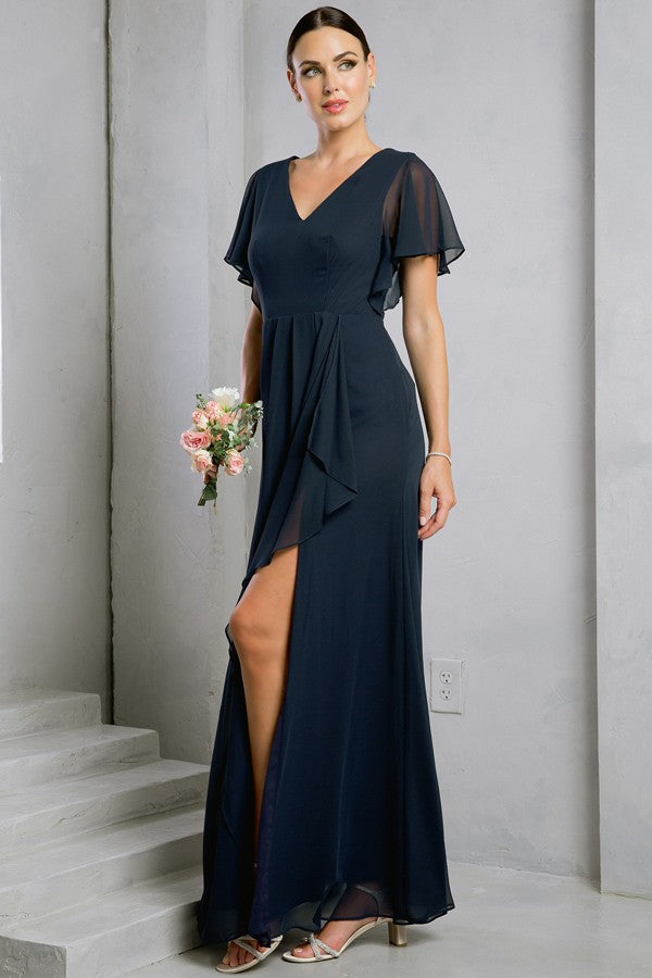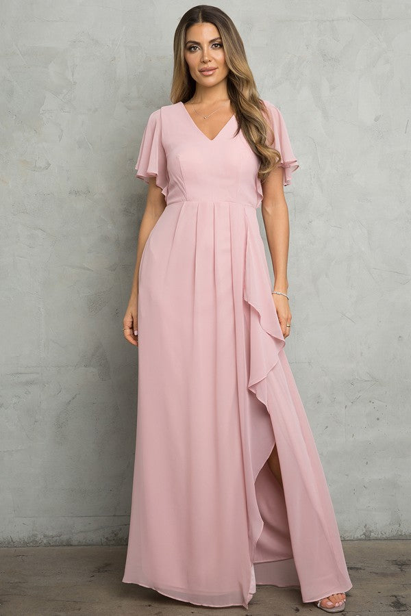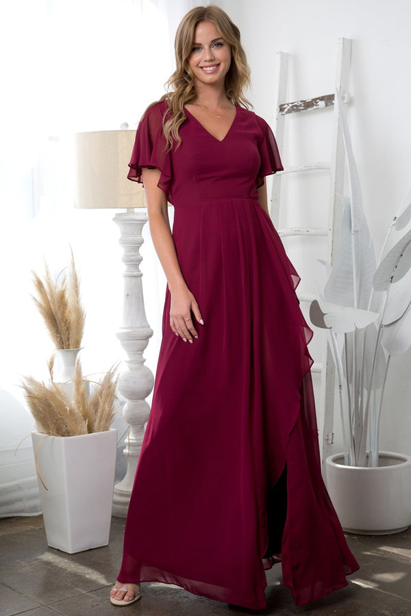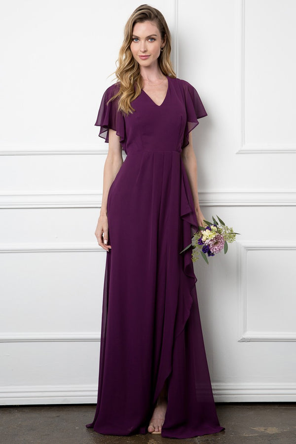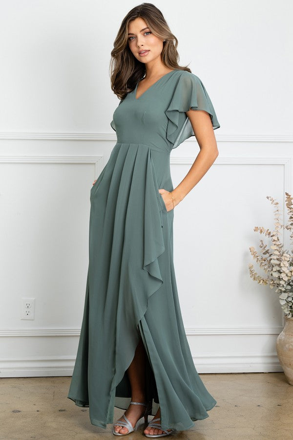 .... Robe de demoiselle d’honneur en chiffon avec manches à volants, fente frontale et poches Élégante robe de demoiselle d’honneur en chiffon, dotée de manches à volants délicates, d’une fente frontale moderne et de poches discrètes. Alliant confort et...
